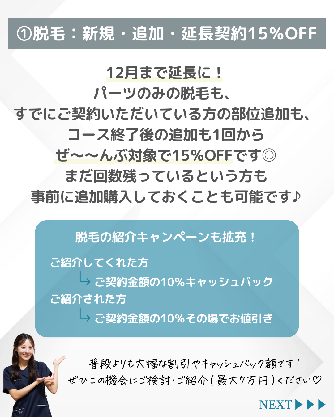 (1)脱毛:新規・追加・延長契約15%OFF延長!